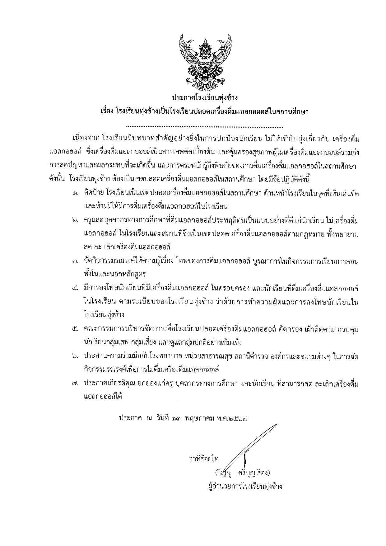 โรงเรียนทุ่งช้างเป็นโรงเรียนปลอดเครื่องดื่มแอลกอฮอล์ในสถานศึกษา