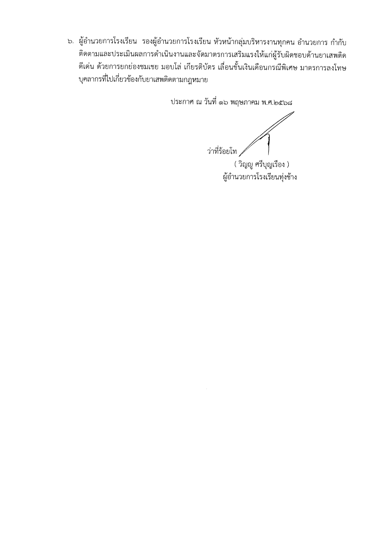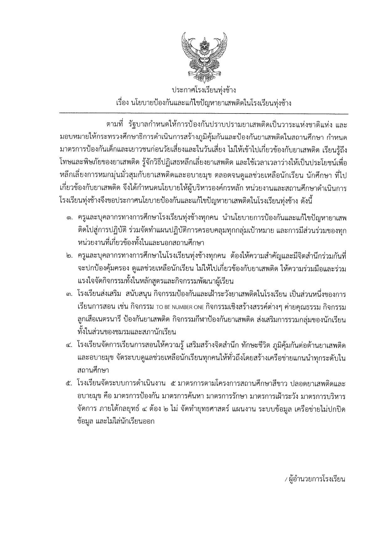 ประกาศ เรื่อง นโยบายป้องกันและแก้ไขปัญหายาเสพติดในโรงเรียนทุ่งช้าง