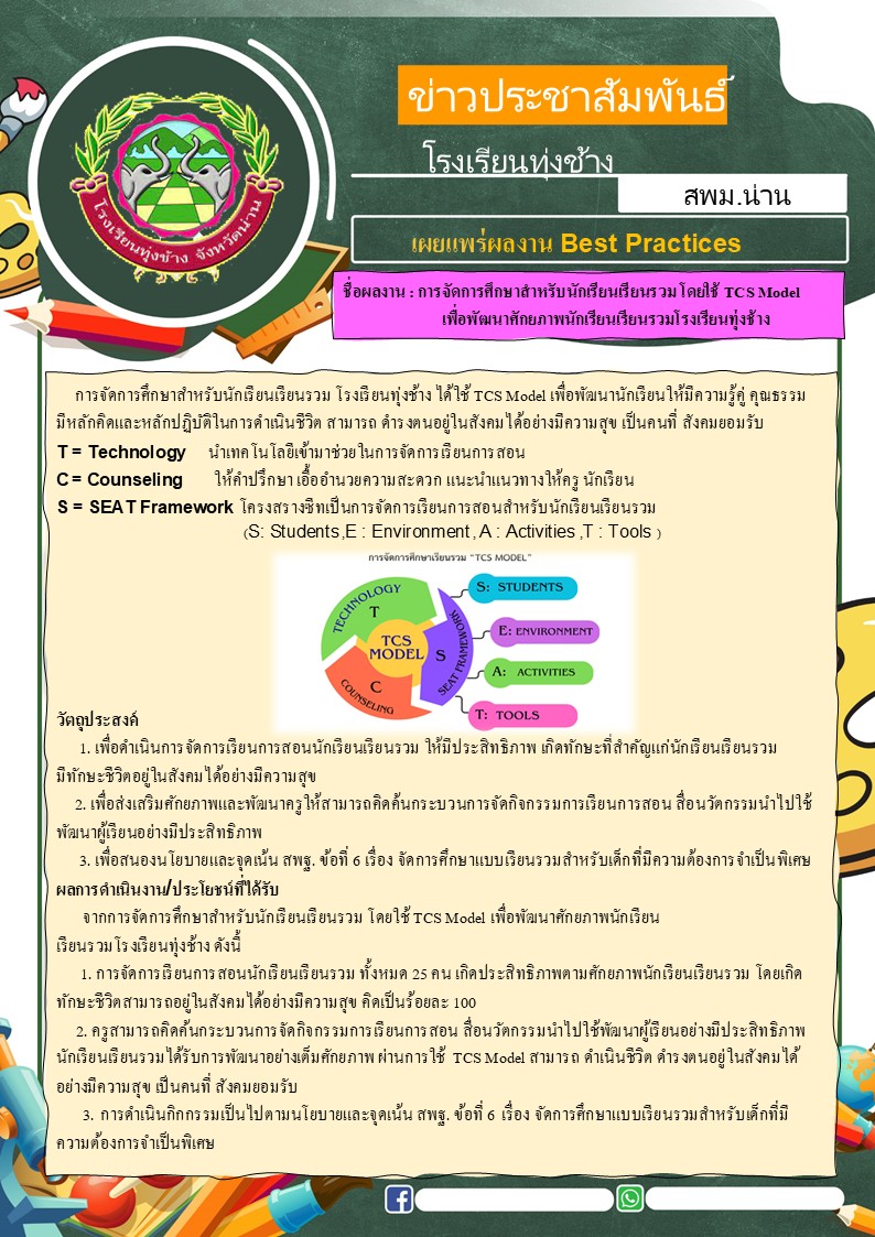 Best Practices การจัดการศึกษาสำหรับนักเรียนเรียนรวม โดยใช้ TCS Model เพื่อพัฒนาศักยภาพนักเรียนเรียนรวมโรงเรียนทุ่งช้าง