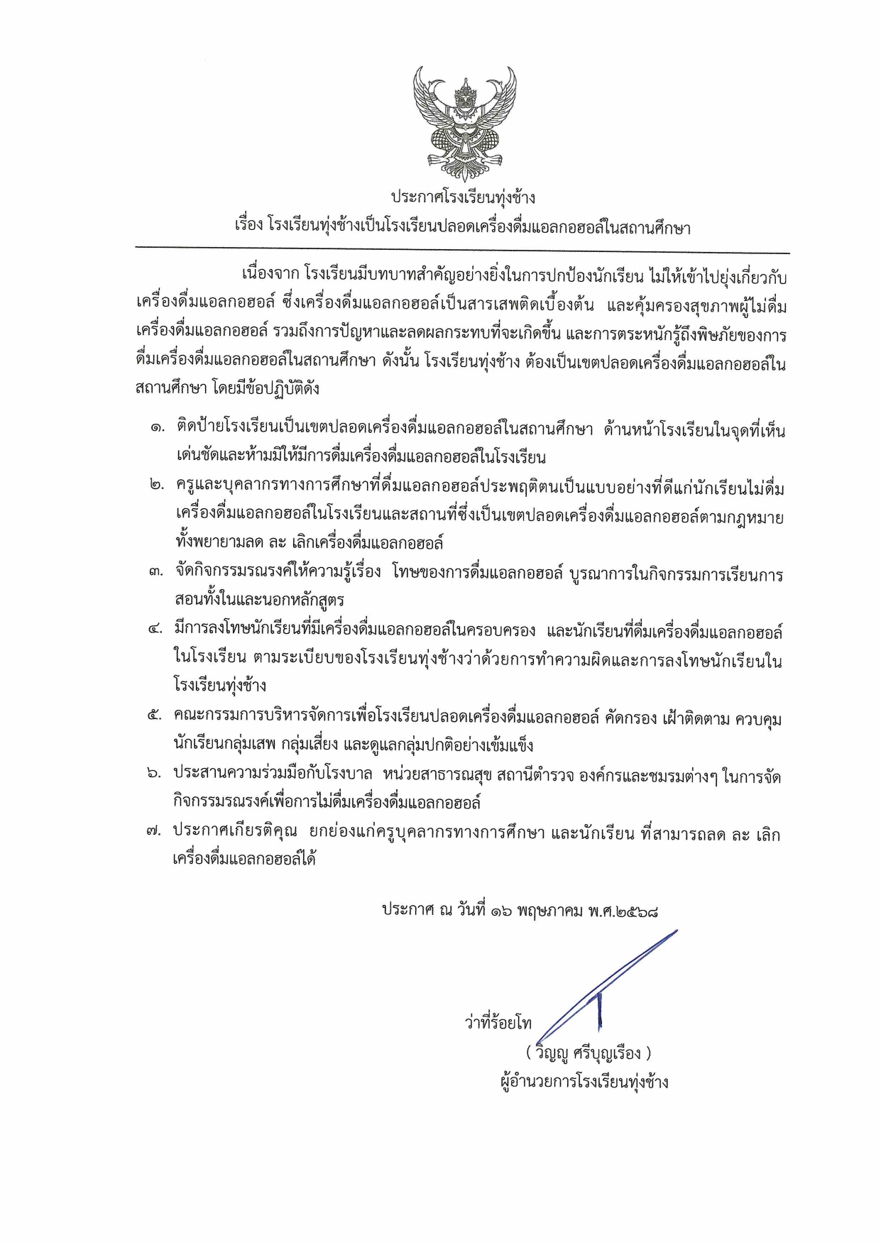 ประกาศ เรื่อง โรงเรียนทุ่งช้างเป็นโรงเรียนปลอดเครื่องดื่มแอลกอฮอล์ในสถานศึกษา